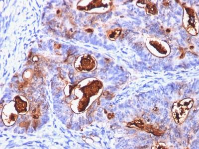Formalin-fixed, paraffin-embedded human Colon Carcinoma stained with CEA Monoclonal Antibody (C66/1260).