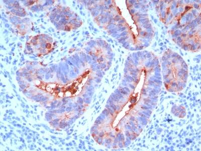Formalin-fixed, paraffin-embedded human Colon Carcinoma stained with CEA Monoclonal Antibody (C66/195).