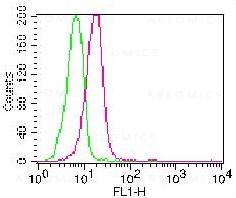 Fig-1:Intracellular FLOW cytometric analysis of Caspase 3 (Clone : ABM1C12) on Jurkat cells using 0.5 µg of antibody. Green represents FITC conjugated IgG1 isotype control (ABEOMICS), red represents FITC conjugated anti-caspase 3 (10-1003-F) antibody.