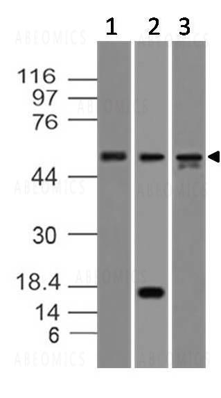 Fig-1:Western blot analysis of Caspase-8. Anti-Caspase-8 antibody (Clone: ABM14C1) was used at 2 µg/ml on Molt-4, Kato III and HepG2 lysates.
