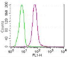 Fig-1:Intracellular FLOW analysis of Jurkat cells using 0.5 µg of antibody. Green represents FITC conjugated isotype control (Abeomics). Red represents FITC conjugated Caspase 8 (10-1019-F).