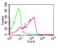 Fig-1: Cell Surface flow analysis of hCD100 in PBMC (Lymphocyte gated) using 0.5 µg/10^6 cells. Green represents isotype control (ABEOMICS); red represents anti-hCD100 antibody (10-4135). Goat anti-mouse PE conjugated secondary antibody (ABEOMICS) was used.