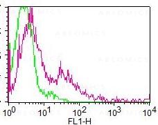 Fig-1: Cell surface flow analysis of hCD20 in PBMC using 0.5 µg/10^6 cells. Green represents isotype control (ABEOMICS); red represents FITC conjugated anti-hCD20 antibody (10-4162F).