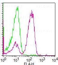 Fig-1: Cell surface flow analysis of hCD3 in PBMC using 0.5 µg/10^6 cells. Green represents isotype control (ABEOMICS); red represents APC conjugated anti-hCD3 antibody (10-4089AC).