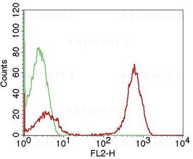 Fig-1: Cell surface flow analysis of CD3 in PBMC using 0.1 µg/10^6 cells. Green represents isotype control; red represents anti-hCD3 antibody conjugated with PE (10-4089PE).