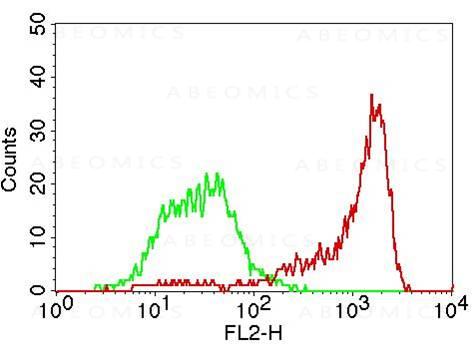 Fig.1: FLOW Cytometry analysis of CD31 in human PBMC using 0.5µg antibody per 10^6 cells. Green represents isotope control. Red represents anti-CD31 antibody (Clone: ABM3E63). Goat anti-mouse IgG conjugated with PE was used as secondary antibody.