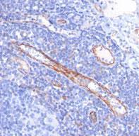 CD31 (PECAM-1, or platelet endothelial cell adhesion molecule-1) is a surface protein expressed by endothelial cells, monocytes, platelets, granulocytes, and lymphocyte subsets, and makes up a large portion of endothelial intercellular junctions. CD31 is a member of the immunoglobulin superfamily and is likely involved in leukocyte migration, angiogenesis, and integrin activation. Reports indicate that CD31 interacts with CD38 and is involved in cellular interactions resulting in wound healing and angiogenesis. Expression of CD31 on CD4+ T lymphocytes, helps to control T lymphocyte activation, because in the absence of CD31, T cells have a greater propensity to become activated, resulting in increased susceptibility to become apoptotic. This impact of CD31 loss becomes most pronounced during severe, inflammatory, and immunological stresses such as those caused by systemic Salmonella infection. This identifies a novel role for CD31 in regulating CD4 T homeostasis. This monoclonal antibody recognizes a 100kDa glycoprotein in endothelial cells and 130 kDa in platelets. This antibody reacts with endothelial cells in normal tissues and in benign and malignant proliferations. In cryostat sections and blood smears the antibody also stains megakaryocytes, platelets and occasionally plasma cells. It reacts weakly with mantle zone B cells, peripheral T cells, and neutrophils. Antibody to CD31 is of value in the study of benign and malignant vascular tumors. Staining for CD31 has also been used to measure angiogenesis, which reportedly predicts tumor recurrence.