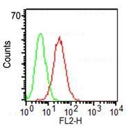 Fig. 1: Cell Surface flow analysis of hCD34 on KG-1 cells using 0.5 µg antibody per 10^6 cells. Green represents isotype control (ABEOMICS); red represents anti-hCD34 antibody (36-3010). Goat anti-mouse PE conjugated secondary antibody was used (ABEOMICS).