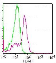 Fig-1: Cell surface flow analysis of hCD4 in PBMC using 0.5 µg/10^6 cells. Green represents isotype control (ABEOMICS); red represents APC conjugated anti-hCD4 antibody (10-4090-AC).