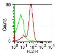 Fig.1: Cell Surface flow analysis of anti-hCD43 antibody (36-3009) in PBMC (Lymphocytes gated) using 0.5 µg/10^6 cells. Green represents isotype control (ABEOMICS); red represents anti-hCD43 antibody. Goat anti-mouse PE conjugated secondary antibody was used (ABEOMICS).