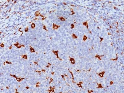 This antibody recognizes a glycoprotein of 110kDa, which is identified as CD68. It is important for identifying macrophages in tissue sections. It stains macrophages in a wide variety of human tissues, including Kupffer cells and macrophages in the red pulp of the spleen, in lamina propria of the gut, in lung alveoli, and in bone marrow. It reacts with myeloid precursors and peripheral blood granulocytes. It also reacts with plasmacytoid T cells, which are supposed to be of monocyte/macrophage origin. It shows strong granular cytoplasmic staining of chronic and acute myeloid leukemia and also reacts with rare cases of true histiocytic neoplasia. Lymphomas are negative or show few granules.