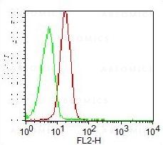 Fig. 1- Cell surface staining of Jurkat cells. Green represents IgG1 Isotype control (Abeomics), Red represents anti-CD78 Clone FN1 (10-4183). 0.5 µg antibody was used. PE conjugated Goat anti-mouse Ig was used as secondary antibody.