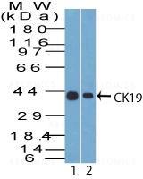 Figure-1: Western blot analysis of CK19. Anti CK19 antibody (Clone: A53-B/A2) was used at 1 µg/ml in 1) HepG2 and 2) MCF7 lysates.