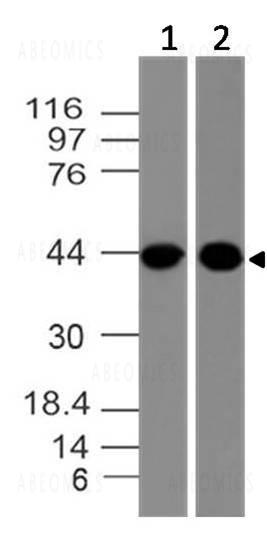 Fig-1: Western blot analysis of ClEC9A. Anti-ClEC9A antibody (Clone: ABM23H8) was used at 2 µg/ml on THP-1 and A431 lysates.