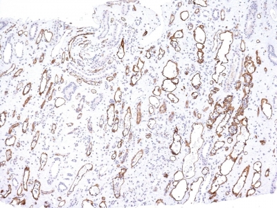 Formalin-fixed, paraffin-embedded human Kidney Transplant stained with Complement 4d Monoclonal Antibody (C4D204).