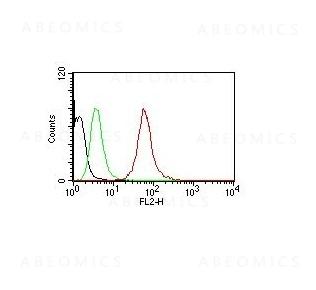 Flow Cytometry of human Pan-Cytokeratins on HeLa Cells. Black: Cells alone; Green: Isotype Control; Red: PE-labeled Pan-Cytokeratin Monoclonal Antibody (SPM115 + SPM116).
