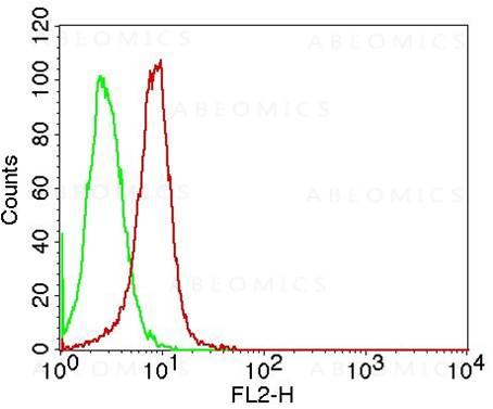 Fig. 1: Intracellular flow cytometric analysis of D4GDI on HeLa cells using 0.5 µg/ 10^6 cells of antibody (Clone: ABM11F9). Green represents isotype control; red represents anti-D4GDI antibody. Goat anti-mouse PE conjugate was used as secondary antibody.