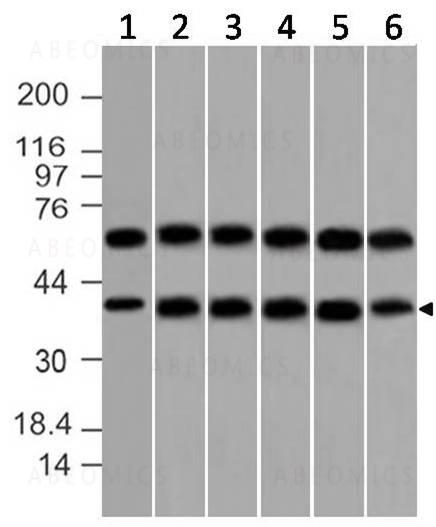 Figure-1:Western blot analysis of DAP-3. Anti-DAP-3 antibody (Clone: ABM15C4) was used at 2 µg/ml on (1) HT-29, (2) Hela, (3) SKBR3, (4) MCF-7, (5) HCT-116 and (6) A549 lysates.