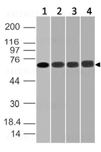 Fig-1: Western blot analysis of DDX3. Anti- DDX3 antibody (Clone: ABM27H2) was used at 2 µg/ml on (1) MCF-7,(2) NIH3T3 (3) HEK293 and (4) EL-4 lysates.
