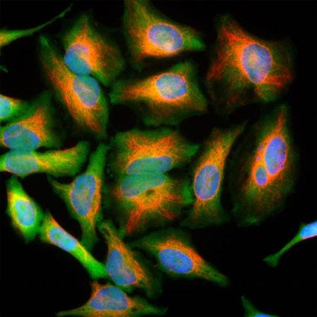 Figure-1: Immunoflourescent analysis of HeLa cells stained with mouse mAb against DJ1,(34-1027), dilution 1:1,000 in green, and costained with chicken pAb to vimentin,(34-1126), dilution 1:10,000, in red. The (34-1027) antibody reveals strong cytoplasmic staining for DJ1 protein, while the(34-1126) antibody stains cytoplasmic intermediate filaments.