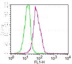 Fig-1: Intracellular FLOW staining of PMA treated Jurkat cells using 0.5 µg of antibody. Green represents FITC conjugated IgG1 isotype control (Abeomics), Red represents FITC conjugated DNMT3a (10-7003-F).