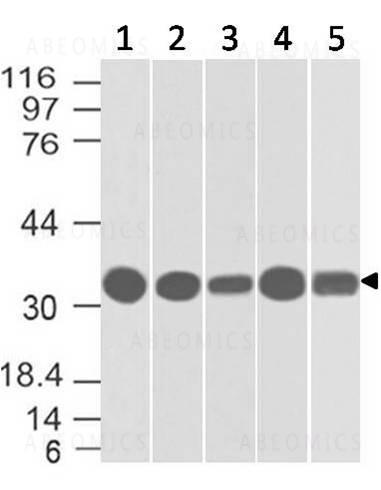 Figure-1: Western blot analysis of EpCAM. Anti- EpCAM antibody (Clone: ABM2C92) was used at 4 µg/ml on (1) h Intestine, (2) PANC-28, (3) A549, (4) h Kidney and (5) Hela lysates.