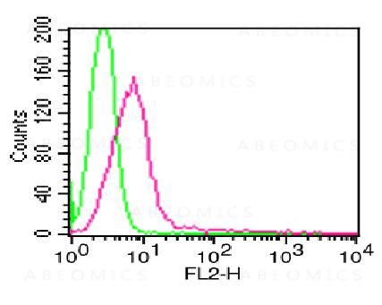 Fig:1- Cell surface flowcytometric analysis of EpCAM in HT 29 Cell line using 0.5 µg/10^6 cells of Anti- EpCAM antibody (Clone: ABM4D85). Green represent isotype control and Red represent Anti-EpCAM antibody (10-7578 Abeomics). Goat Anti-Mouse PE conjugated was used as the secondary control.
