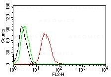 Flow Cytometry for human ER-beta on MCF-7 Cells. Black: Cells alone; Green: Isotype Control; Red: PE-labeled ER-beta1 Monoclonal Antibody (ERb455).