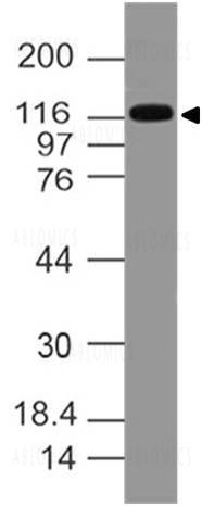 Fig:1- Expression analysis of FLT3. Anti-FLT3 antibody (Clone: ABM5C12) was tested at 4 µg/ml on Jurkat lysate.