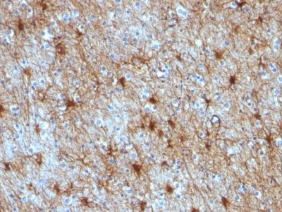 This MAb recognizes a protein of ~50kDa which is identified as Glial Fibrillary Acidic Protein (GFAP). It shows no cross-reaction with other intermediate filament proteins. GFAP is specifically found in astroglia. GFAP is a very popular marker for localizing benign astrocyte and neoplastic cells of glial origin in the central nervous system. Antibody to GFAP is useful in differentiating primary gliomas from metastatic lesions in the brain and for documenting astrocytic differentiation in tumors outside the CNS.