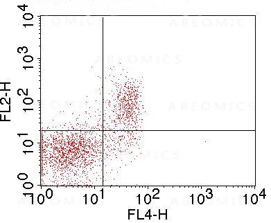 Figure-1: Cell surface flowcytometric staining of mGITR (Clone: DTA-1) in mouse Thymocytes. Mouse Thymocytes were first stained with Anti-mCD3 APC conjugated, mCD3 APC positive cells were gated and further analyzed for mGITR using 0.5 µg/10^6. Goat anti-Rat PE secondary antibody (ABEOMICS) was used.