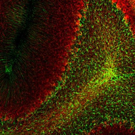 Figure 1: Mixed neuron-glial cultures stained with 34-1043, and chicken polyclonal antibody to neurofilament NF-L 34-1084 (green). The GFAP antibody stains the network of astrocytes in these cultures, while the NF-L antibody stains neurons and their processes. The blue channel shows the localization of DNA. This antibody also works on formalin fixed paraffin embedded brain tissues, as shown here.