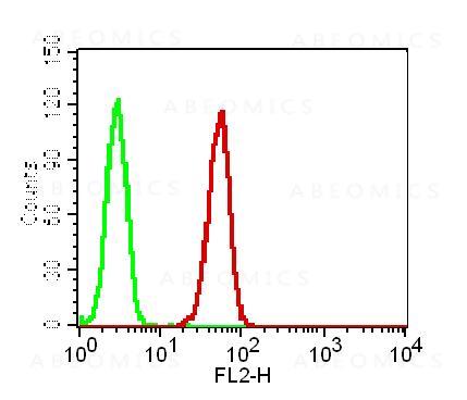 Figure-1: Cell surface flowcytometry analysis of GPR44 on HepG2 cells using 0.5 µg/10^6 Cells of Anti-GPR44 antibody (Clone: ABM2C77). Green represent isotype control and red represent Anti GPR44 antibody (Abeomics 10-10015). Goat anti mouse PE conjugated was used as the secondary antibody.