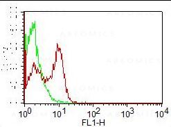 Fig-1: Cell Surface flow analysis of hCD100 FITC in PBMC (Lymphocyte gated) using 0.2µg/10^6 cells. Green represents FITC conjugated isotype control (ABEOMICS); red represents anti-hCD100 FITC antibody (10-4135-F).