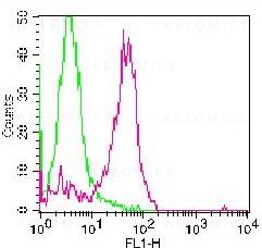 Fig-1: Cell Surface flow analysis of Anti- hCD13 in PBMC (Granulocytes gated) using 0.2 µg/10^6 cells. Green represents FITC conjugated isotype control (ABEOMICS); red represents FITC conjugated anti-CD13 antibody (10-4128-F).