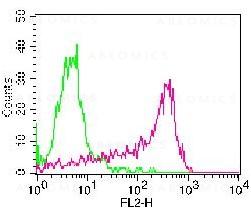 Fig:1- Cell surface flow analysis of hCD14 in human PBMC using 0.5 µg/10^6 cells. Green represents isotype control (ABEOMICS); red represents anti-hCD14 antibody (10-4077). Goat anti-mouse PE conjugated secondary antibody (ABEOMICS) was used.