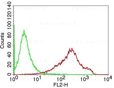 Figure-1: Surface flow cytometric analysis of CD19 on Raji cells using 0.5 µg antibody per 10^6 cells of antibody (Clone: CB19). Green represents isotype control; red represents anti-CD19 antibody (10-4075). Goat anti-mouse PE conjugate secondary antibody was used.