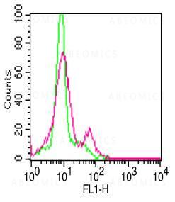 Figure-1: Cell Surface flow analysis of hCD19 in PBMC (Lymphocyte gated) using 0.5 µg/10^6 cells. Green represents isotype control (ABEOMICS); red represents hCD19 antibody (10-4127). Goat anti-mouse FITC conjugated secondary antibody (ABEOMICS) was used.