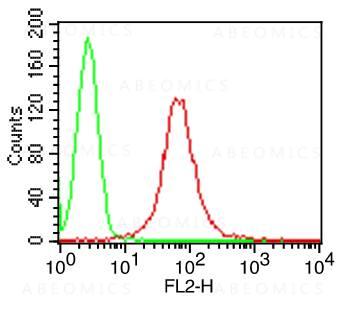Fig-1: Cell Surface flow analysis of hCD1a in Molt-4 cells using 1 µg/10^6 cells. Green represents isotype control (ABEOMICS); red represents anti-hCD1a antibody (10-4133, clone:CBT6). Goat anti-mouse PE conjugated secondary antibody (ABEOMICS) was used.