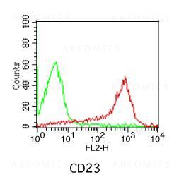 Fig-1: Cell Surface flow analysis of hCD23 in PBMC (Lymphocytes) using 1 µg/10^6 cells. Green represents isotype control (ABEOMICS); red represents anti-hCD23 antibody (10-4175). Goat anti-mouse PE conjugated secondary antibody (ABEOMICS) was used.