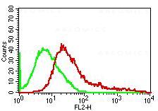 Fig:1- Cell surface flow analysis of hCD25 in human PBMC using 0.5 µg/10^6 cells. Green represents isotype control (ABEOMICS); red represents anti-hCD25 antibody (10-4125). Goat anti-mouse PE conjugated secondary antibody (ABEOMICS) was used.