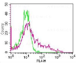 Fig:1- Cell surface FLOW analysis of hCD25 in PHA treated human PBMC using 0.2 µg/10^6 cells. Green represents APC conjugated mouse IgG2a isotype control (ABEOMICS); red represents APC conjugated anti-hCD25 antibody (10-4125-AC).
