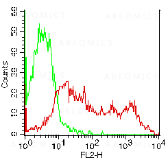 Fig:1- Cell surface FLOW analysis of hCD25 in PHA treated human PBMC using 0.2µg/10^6 cells. Green represents PE conjugated mouse IgG2a isotype control (ABEOMICS); red represents anti-hCD25 antibody (10-4125-P).