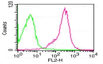Fig-1: Cell Surface flow analysis of hCD47 in PBMC (Lymphocytes) using 0.5 µg/10^6 cells. Green represents isotype control ABEOMICS); red represents anti-hhCD47 antibody (10-4160). Goat anti-mouse PE conjugated secondary antibody (ABEOMICS) was used.