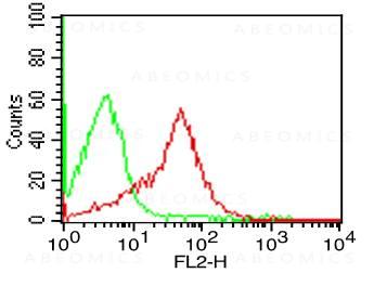 Fig-1: Cell Surface flow analysis of hCD50 in PBMC (Lymphocyte gated) using 1 µg/10^6 cells. Green represents isotype control (ABEOMICS); red represents anti-hCD50 antibody (10-4151). Goat anti-mouse PE conjugated secondary antibody (ABEOMICS) was used.