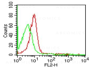Fig-1: Cell Surface flow analysis of hCD50 in PBMC (Lymphocyte gated) using 1 µg/10^6 cells. Green represents isotype control (ABEOMICS); red represents anti-hCD50 antibody (10-4152). Goat anti-mouse PE conjugated secondary antibody (ABEOMICS) was used.