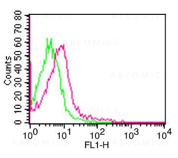 Fig-1: Cell Surface flow analysis of hCD50 in PBMC (Lymphocyte gated) using 1 µg/10^6 cells. Green represents isotype control (ABEOMICS); red represents FITC conjugate anti-hCD50 antibody (10-4152F).
