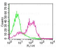 Fig-1: Cell Surface flow analysis of hCD6 in PBMC (Lymphocyte gated) using 0.5 µg/10^6 cells. Green represents isotype control (ABEOMICS); red represents FITC conjugated anti-hCD6 antibody (10-4130F, clone:SPV14)
