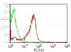 Fig-1: Cell Surface FLOW analysis of hCD7 FITC in PBMC (Lymphocyte gated) using 0.2 µg/10^6 cells. Green represents isotype control (ABEOMICS); red represents hCD7 FITC conjugated antibody (10-4129-F, clone:BF12).