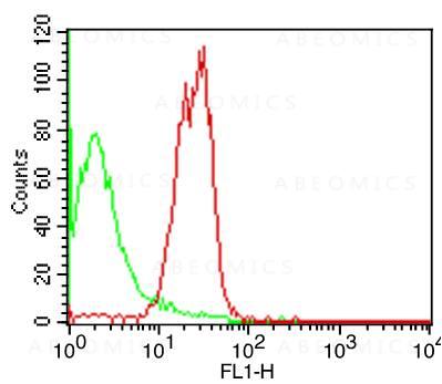 Fig-1: Cell Surface flow analysis of hCD98 in PBMC (Lymphocytes) using 0.5 µg/10^6 cells. Green represents isotype control (ABEOMICS); red represents anti-hCD98 antibody (10-4140). Goat anti-mouse FITC conjugated secondary antibody (ABEOMICS) was used.